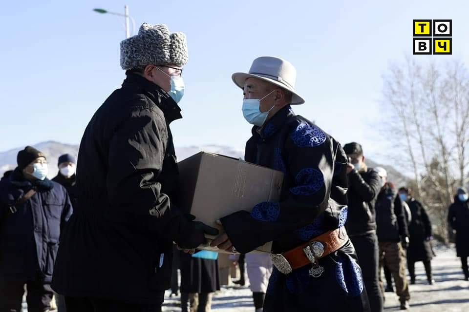 УИХ-ын дарга Г.Занданшатар тус аймгийн ахмад настнууд, малчин 14000 өрхөд зориулж, 140 тонн гурил, 70 тонн цагаан будаа, 7000 ширхэг цай, нийт 400 тонн хүнс, тэжээл авчирснаа гардуулан өгөв. Мөн 100.000 ширхэг маскийг аймгийн Онцгой комисст өглөө.