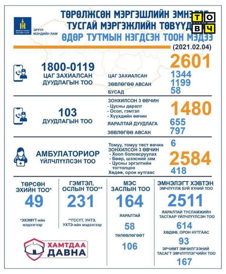 Яаралтай түргэн тусламжийн 103 дугаарт 1480 дуудлага ирснээс 655 нь яаралтай тусламж, 797 нь зөвлөгөө мэдээлэл авчээ. Харин 1800-0119 зөвлөгөө мэдээллийн дугаараас 2601 хүн мэдээлэл авчээ.