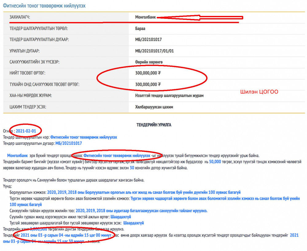 Тодруулбал, Монгол банкны Ерөнхийлөгч Б.Лхагвасүрэн 2021 оны 02 сарын 01-ний өдөр 300 сая төгрөгийн үнэ бүхий гүйлтийн цана, суугаа гуяны 2 толгойт булчин хөгжүүлэгч зэрэг фитнесийн тоног төхөөрөмж худалдан авах тендерийг зарлажээ. Ингэхдээ тендерт оролцогч нь Монгол банкны нэрээр зарласан уг тендерт материалаа гуравдугаар сарын 04-ний дотор ирүүлэхийг шаардсан байна.