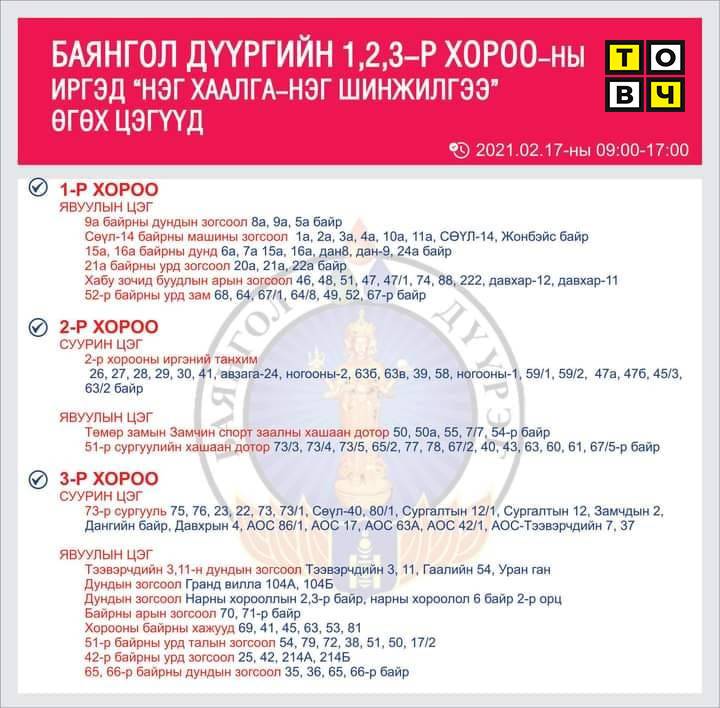 Баянголд дүүргийн хороодод өнөөдөр 09:00-17:00 цагийн хооронд "Нэг хаалга-Нэг шинжилгээ" авах байршлыг танилцуулж байна.