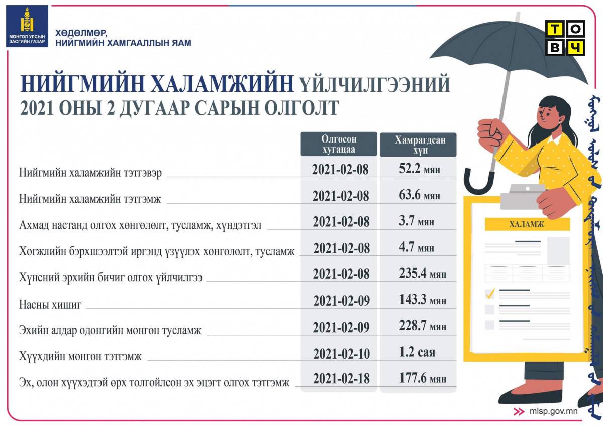 Нийгмийн халамжийн үйлчилгээний 2 дугаар сарын тэтгэвэр, тэтгэмж, үйлчилгээнүүдийг энэ сарын 8-наас иргэдийн www.ehalamj.mn халамжийн нэгдсэн системд холбосон данс руу шууд олгож эхэлсэн. Харин өчигдөр буюу 2 дугаар сарын 18-наас Эх, олон хүүхэдтэй өрх толгойлсон эхийн мөнгөн тэтгэмжийг олгож байна.