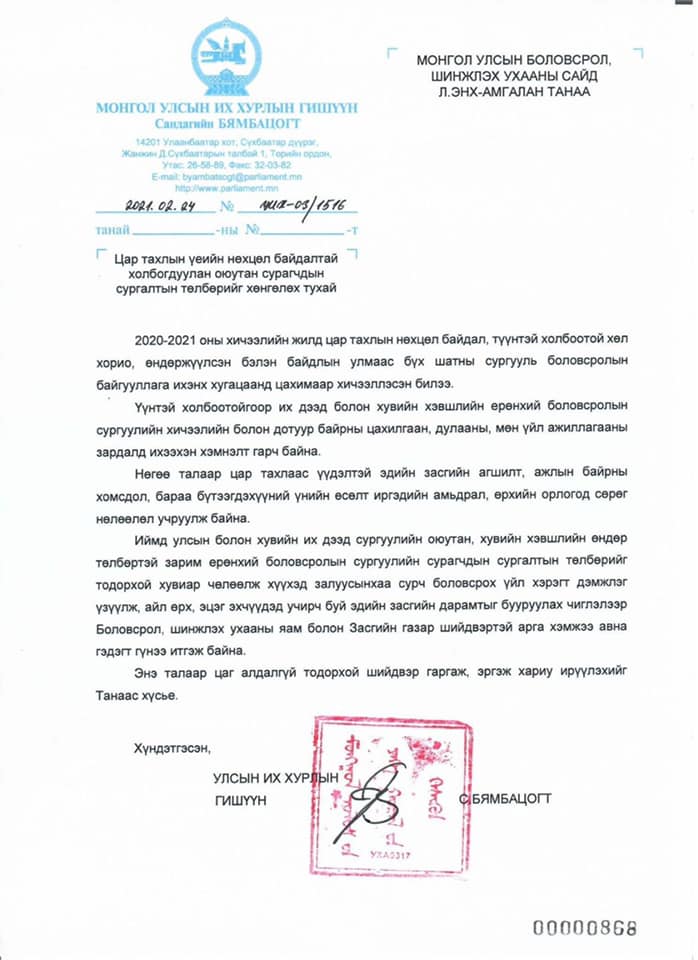 УИХ-ын гишүүн С.Бямбацогт сургалтын төлбөрийг хөнгөлөх асуудлаар БШУ-ны сайдад ханджээ. Тэрбээр энэ талаар цахим хуудаснаа "2020-2021 оны хичээлийн жилд цар тахлын улмаас бүх шатны сургууль боловсролын байгууллага ихэнх хугацаанд цахимаар хичээллэсэн.