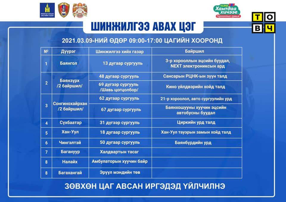 Нийслэлийн хэмжээнд өнөөдөр дараах цэгүүдэд коронавирусийн халдвар илрүүлэх PCR шинжилгээг авна.