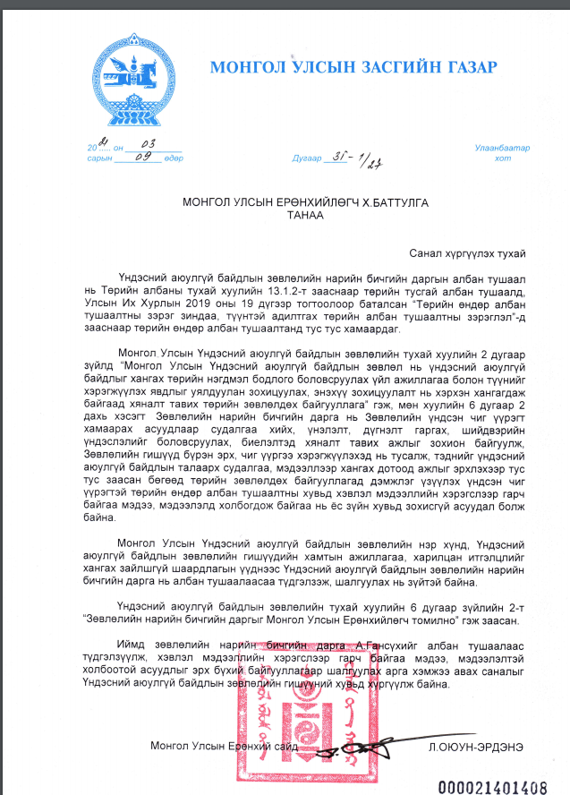 Ерөнхий сайд Л.Оюун-Эрдэнэ Үндэсний аюулгүй байдлын зөвлөлд албан бичиг илгээлээ.