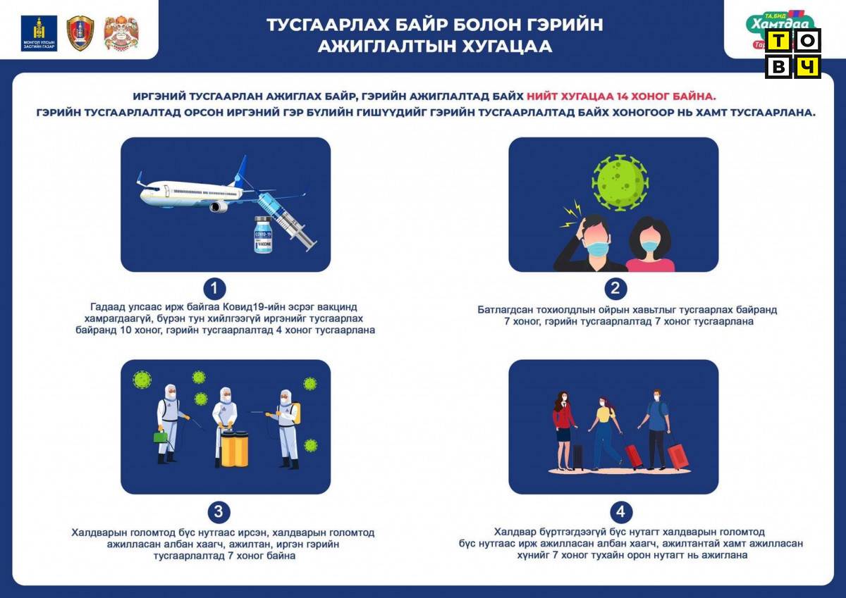 1. Гадаад улсаас ирж байгаа коронавирусийн эсрэг вакцинд хамрагдаагүй, бүрэн тун хийлгээгүй иргэнийг тусгаарлах байранд 10 хоног, гэрийн тусгаарлалтад 4 хоног тусгаарлана.
