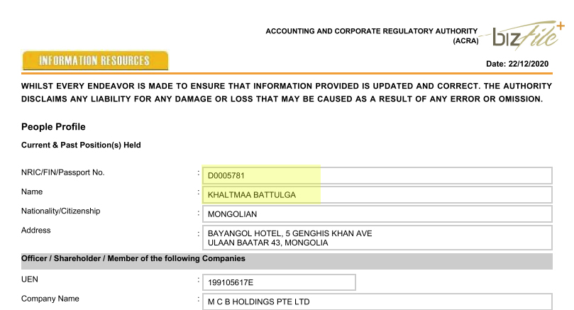 Шаравын Наранцацрал /хи76….61/ 1976 онд төрсөн бөгөөд Сүхбаатар дүүргийн 11 хорооллын энгийн нэгэн байранд амьдардаг аж. Харин Сингапур улсын иргэн Билли Лим Сим Пау нь Эм Эм Ай Ди ХХК-ны үүсгэн байгуулагч, GENCO HOLDINGS PTE ХХК-ний үүсгэн Ерөнхийлөгч нэрээр 2011 оноос Монголд амьдарч байгаа.