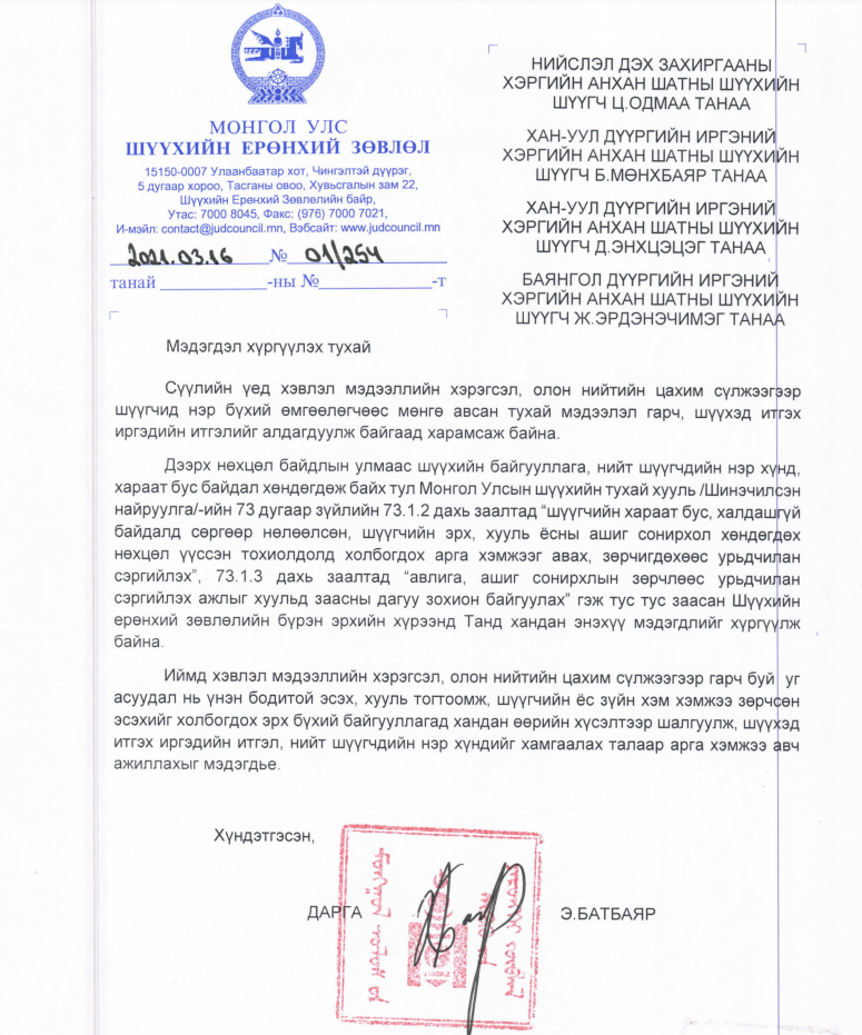 Тэгвэл уг мэдээллийг дагуу Шүүхийн Ерөнхий зөвлөл нэр холбогдсон шүүгчдэд хандаж албан бичиг илгээлээ.