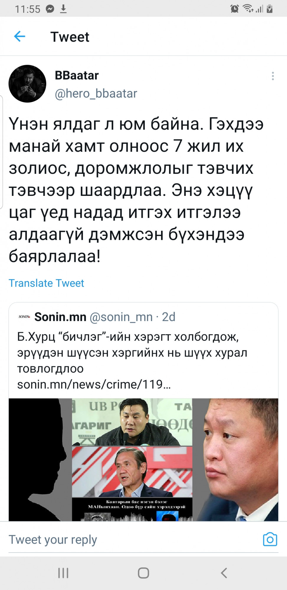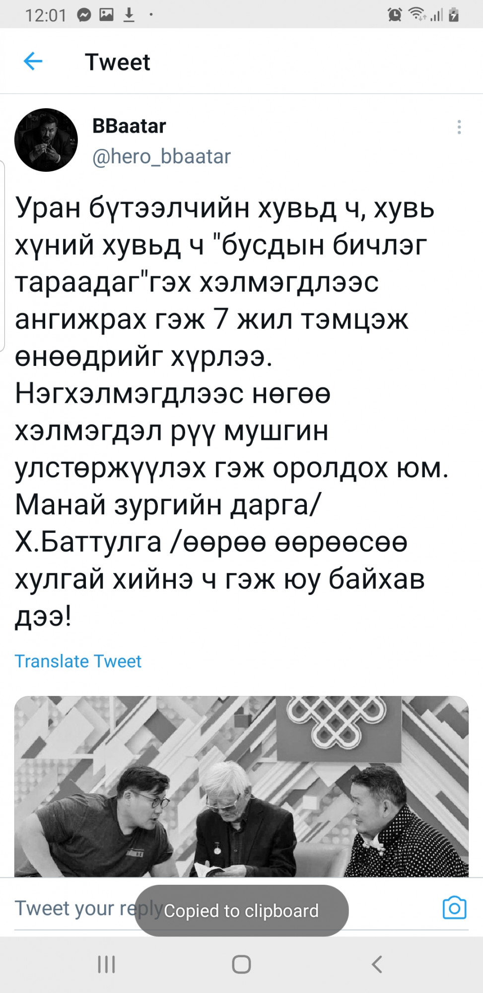 Энэ талаар найруулагч Б.Баатар “Уран бүтээлчийн хувьд ч, хувь хүний хувьд ч "бусдын бичлэг тараадаг" гэх хэлмэгдлээс ангижрах гэж 7 жил тэмцэж өнөөдрийг хүрлээ. Нэг хэлмэгдлээс нөгөө хэлмэгдэл рүү мушгин улстөржүүлэх гэж оролдох юм. Үнэн ялдаг л юм байна. Гэхдээ манай хамт олноос 7 жил их золиос, доромжлолыг тэвчих тэвчээр шаардлаа. Энэ хэцүү цаг үед надад итгэх итгэлээ алдаагүй дэмжсэн бүхэндээ баярлалаа!” гэж твиттер хуудсандаа бичжээ.