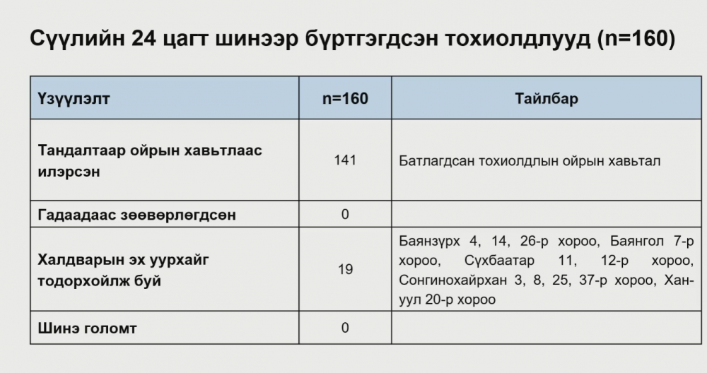 ЭМЯ-наас коронавирусний талаарх ээлжит мэдээллээ хийж байна. 2021 оны 3 дугаар сарын 18-ны өдөр шинээр 160 тохиолдол батлагдсан. Батлагдсан тохиолдлын 141 нь халдвартай хүмүүсийн ойрын хавьтлууд бол 19 хүний халдварын эх уурхайг тогтоохоор ажиллаж байна.