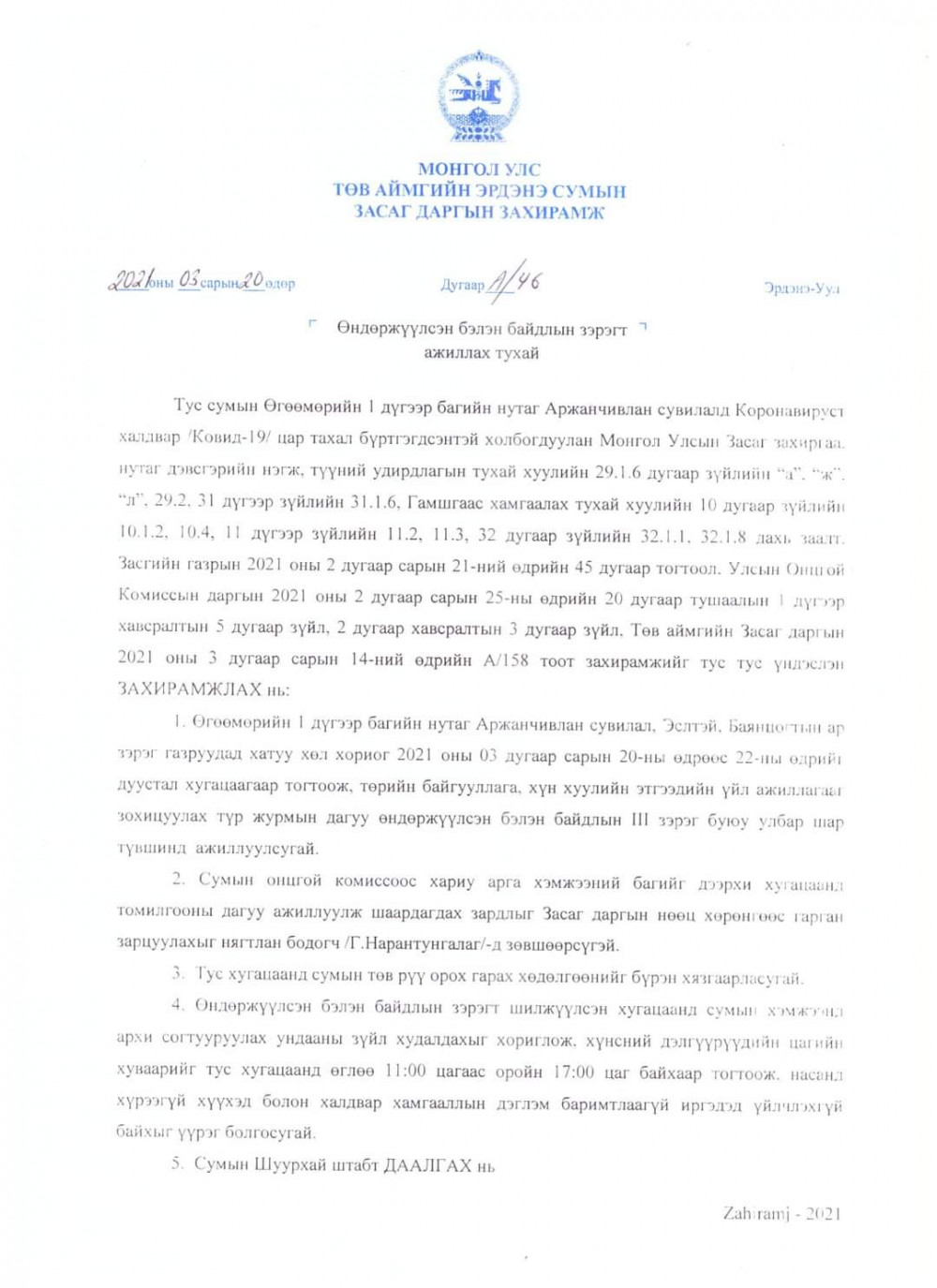 Өчигдөр /2021.03.20/ Төв аймгийн онцгой комиссоос коронавирусний халдварын тохиолдол нэмэгдэж 21 болсон талаар мэдээлсэн. Тодруулбал Мөнгөнморьт суманд ажилладаг замын компанийн нэг ажилтнаас коронавирус илэрсэн. Тэгвэл тус аймагт халдвар дахин бүртгэгджээ. Эрдэнэ сумын Аржанчивлан сувилалд хэвтэн эмчлүүлж байсан нэг иргэний давтан шинжилгээ эсрэг гарчээ. Улмаар ойрын хавьтлын 35 ажилтныг шинжилгээнд хамруулахад 6 ажилтны шинжилгээ эерэг гарсан байна. Тус суманд халдвар илэрсэнтэй холбогдуулан сумын шуурхай штаб хоёр хоногийн хатуу хөл хорио тогтоох шийдвэр гаргажээ.