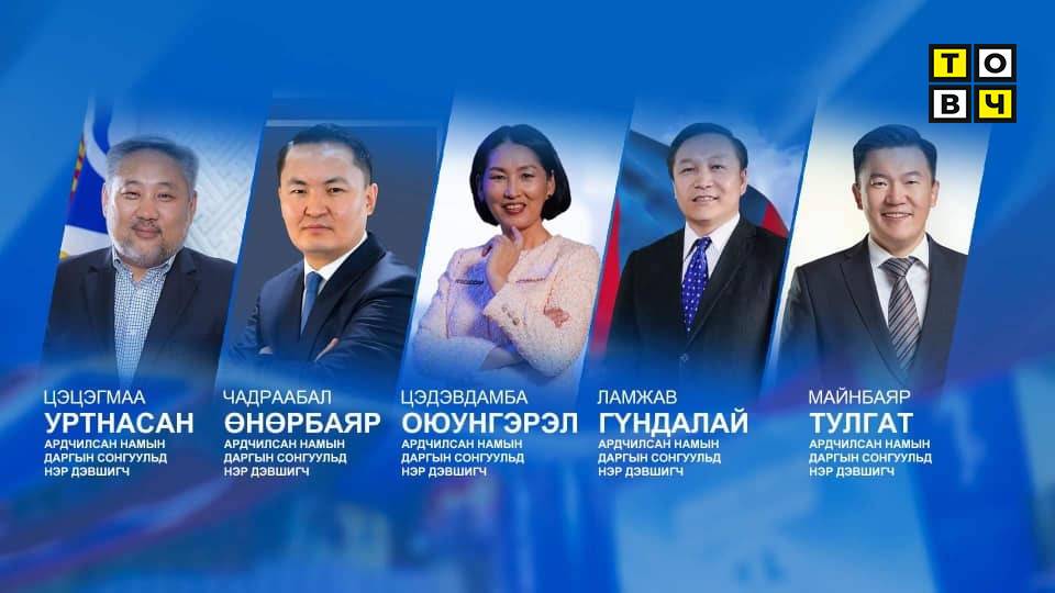 Тухайлбал, УИХ-ын гишүүн асан Л.Гүндалай, Ц.Оюунгэрэл, НИТХ-ын төлөөлөгч М.Тулгат, АН-ын дэд дарга Ц.Уртнасан, АН-ын дэд дарга Ч.Өнөрбаяр нар АН-ын даргын төлөө цахим сонгуульд нэр дэвшиж байна.