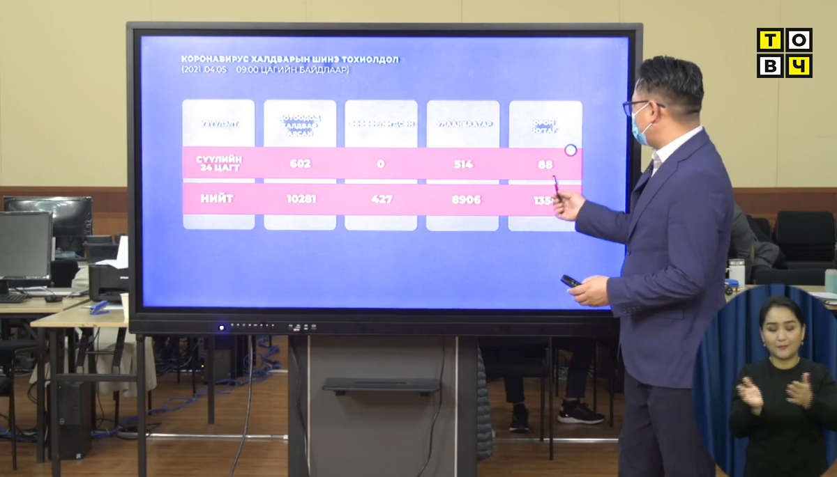 ЭМЯ-наас коронавирусний талаарх ээлжит мэдээллээ хийж байна. 2021 оны 4 дүгээр сарын 5-ны өдрийн 9 цагийн байдлаар нийт 10820 шинжилгээ хийснээс 602 тохиолдол батлагдлаа.