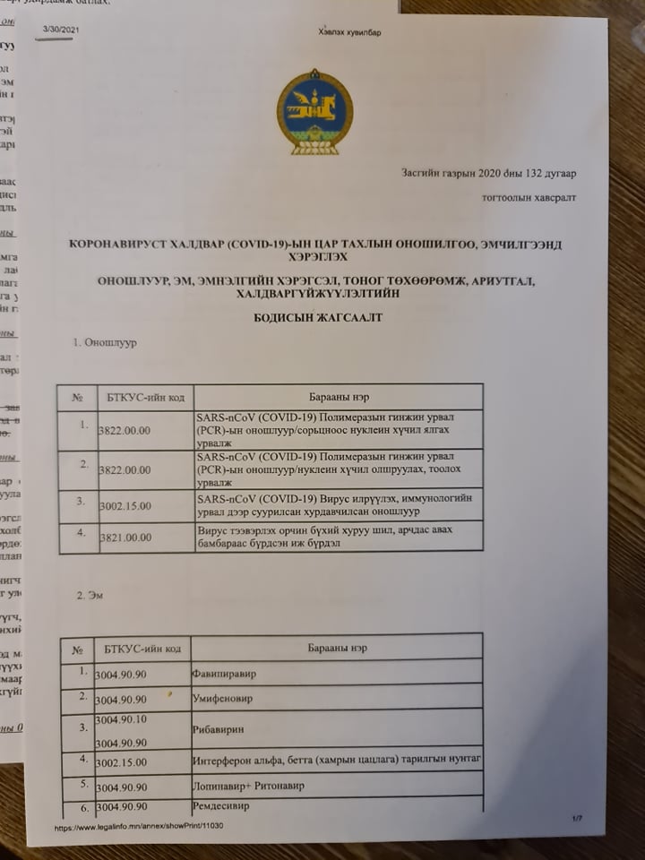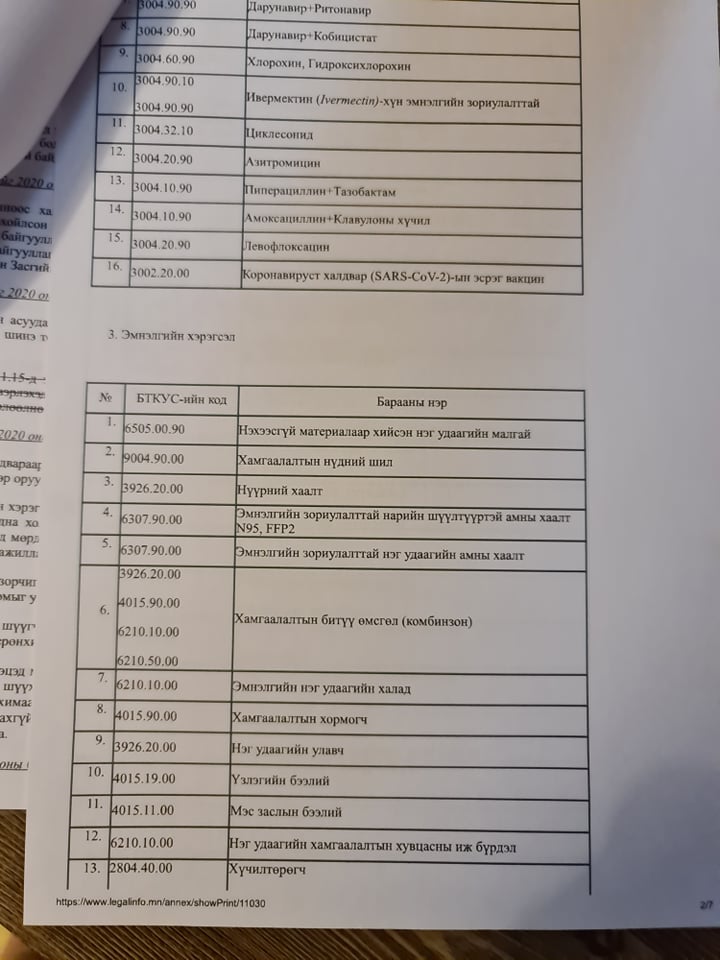 УИХ өнгөрсөн онд дэлхий дахинд цар тахал дэгдсэнтэй холбогдуулан Коронавируст халдвар /ковид-19/-ын цар тахлаас урьдчилан сэргийлэх, тэмцэх, нийгэм, эдийн засагт үзүүлэх сөрөг нөлөөллийг бууруулах тухай хууль баталсан. Энэ хуулийн 9.6. Энэ хуулийн 7.1.15-д заасан нөөц бүрдүүлэх зорилгоор бараа бүтээгдэхүүнийг импортлоход түүнчлэн дотооддоо үйлдвэрлэхэд шаардагдах түүхий эд, тоног төхөөрөмжийг гаалийн болон нэмэгдсэн өртгийн албан татвараас чөлөөлнө гэж заасан. Манай улсад эм, эмнэлгийн хэрэгсэл үйлдвэрлэдэг нэгээр тогтохгүй үйлдвэрлэгч бий. Маск, бээлий, хамгаалалтын хувцас гээд нэг удаагийн эм, эмнэлгийн хэрэгсэл үйлдвэрлэдэг үйлдвэрлэгчдэд зохих үр дүнгээ өгсөн.
