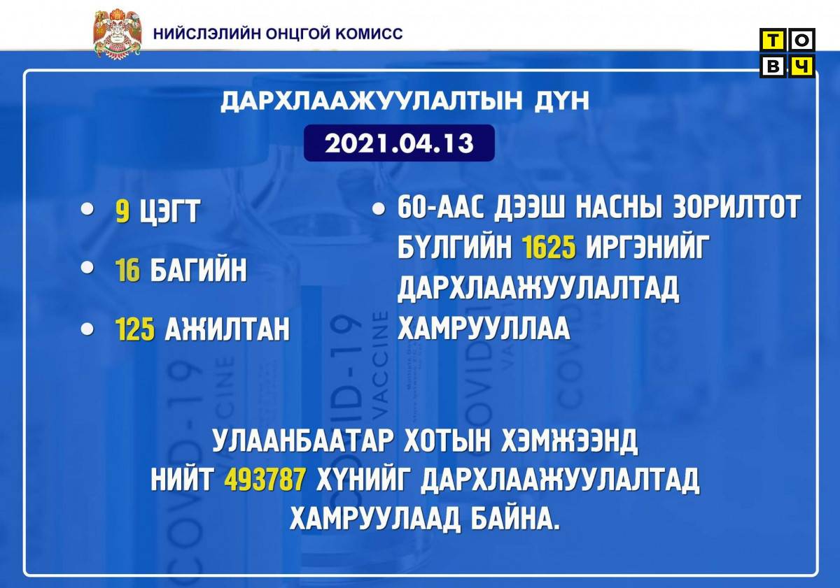 2021.04.13-нд нийслэлийн хэмжээнд дархлаажуулалтын ЕСӨН суурин цэгт 16 багийн 125 эмч, ажилтан ажиллаж, 60-аас дээш насны эрүүл мэндийн IV бүлэгт багтах иргэдийг вакцинд хамрууллаа. Ийнхүү нэгдүгээр тунд 1613, хоёрдугаар тунд 12, нийт 1625 иргэнийг дархлаажуулсан байна. Ингэснээр вакцинжуулалт эхэлснээс хойш нийслэлийн хэмжээнд нийт 493787 иргэнийг дархлаажуулалтад хамрууллаа.
