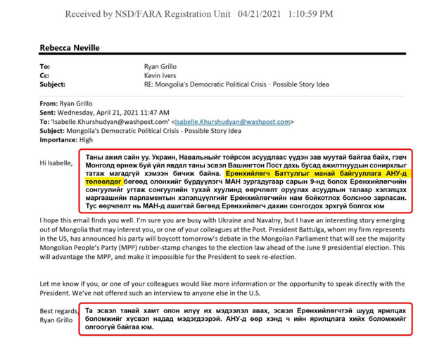 Уг и-мейлийг “Вашингтон пост” сонинд сурвалжлага бэлддэг Москвагийн Изабель Хуршудян гэх сэтгүүлчид илгээжээ. “Чамайг Украйн, Навальныйгийн асуудал гээд зав багатай байгааг мэдэх ч…” хэмээн и-мейлээ эхлүүлж сонирхолтой нийтлэлийн санаа гэж Монгол улсын сонгуулийн талаар ярьсан байна.