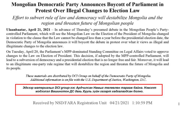 Ардчилсан нам удахгүй болох сонгуулийг угтаж гадны лобби компанитай тохиролцож хамтран ажиллахаар болсон гэрээ хэдхэн хоногийн өмнө ил болсон. Энэ асуудлыг “Бидэнд хамаагүй” гэж Ардчилсан намаас УИХ-д сонгогдсон гишүүд мэдэн, будилж байсан ч “DCI” группт захиалга өгч хамтран ажиллаж байгаа хүмүүсийг илчилсэн цахим шуудангууд ил боллоо. Эдгээр мэдээлэл нь Америкийн нэгдсэн улсын Хууль зүйн яамны албан ёсны вэб сайт дахь цахим архивын хэсэгт нээлттэй хадгалагдаж байгаа юм.