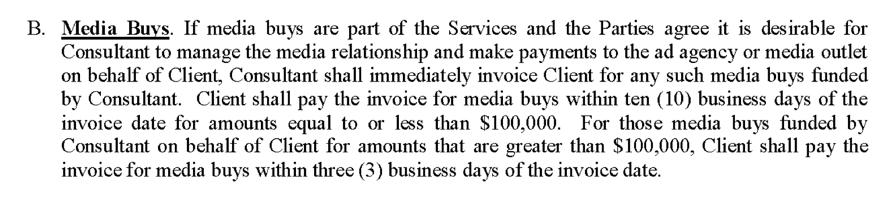 Үүнд хэвлэл, мэдээллээр өөрсдийн хүссэн мэдээллийг гаргах харилцааг тус фирм Захиалагчийг бүрэн төлөөлөн хийх бөгөөд 100 мянган доллар хүртэлх төлбөрийг 10 хоногийн дотор шилжүүлэх шаардлагатай гэжээ. Мөн 100 мянган доллараас дээшхи үнийн дүнтэй хэвлэл, мэдээллийн зардлыг гурав хоногийн дотор шилжүүлнэ гэж заасан байгаа нь асар өндөр төлбөрийг, түргэн шуурхай гаргаж өгч байхаар зөвшөөрчээ. Ийнхүү төлбөрөө төлж олон улсын хэвлэлээр “хүссэн дуугаа захиалан” улс, эх орноо зориудаар муухай харагдуулах үйл ажиллагаагаа гэрээгээр албажуулсан байна.