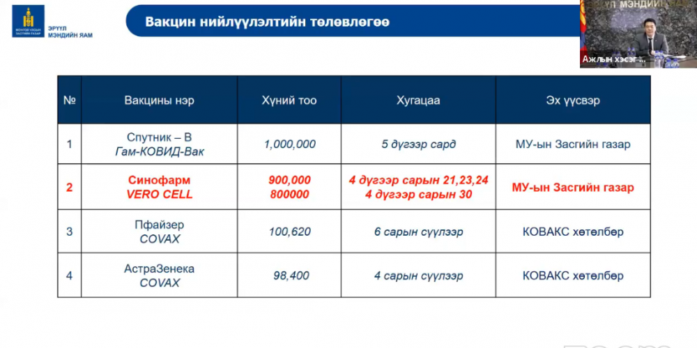 Засгийн газраас авч хэрэгжүүлж байгаа вакцин нийлүүлэлтийн төлөвлөгөөг танилцуулж байна. Уг төлөвлөгөөгөөр "Спутник В" вакцины 1 сая тун ирэх 5 дугаар сард ирэх бол Вероселл, АстраЗенека вакцины дараагийн 800 мянган тун энэ сарын 30-нд, ковакс хөтөлбөрийн хүрээнд Пфайзер вакцины 10620 тун ирэх 6 дугаар сард ирэх төлөвлөгөөтэй байна.