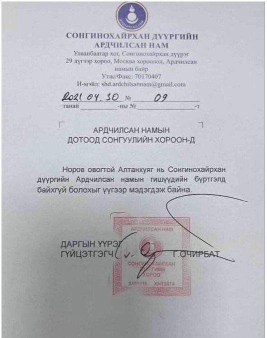 Ерөнхийлөгчийн сонгуульд АН-аас нэр дэвшихээр өргөдлөө өгсөн Н.Алтанхуяг АН-ын гишүүнчлэлгүйг нотолсон албан бичгийг түүний харьяалагдаж байсан Сонгинохайрхан дүүргийн АН-аас мэдэгджээ. 2021 оны 04 дүгээр сарын 30-ны өдрөөр огноолсон 09 тоот албан бичигт “Норов овогтой Алтанхуяг нь Сонгинохайрхан дүүргийн Ардчилсан намын гишүүдийн бүртгэлд байхгүй болохыг үүгээр мэдэгдэж байна” гэжээ.