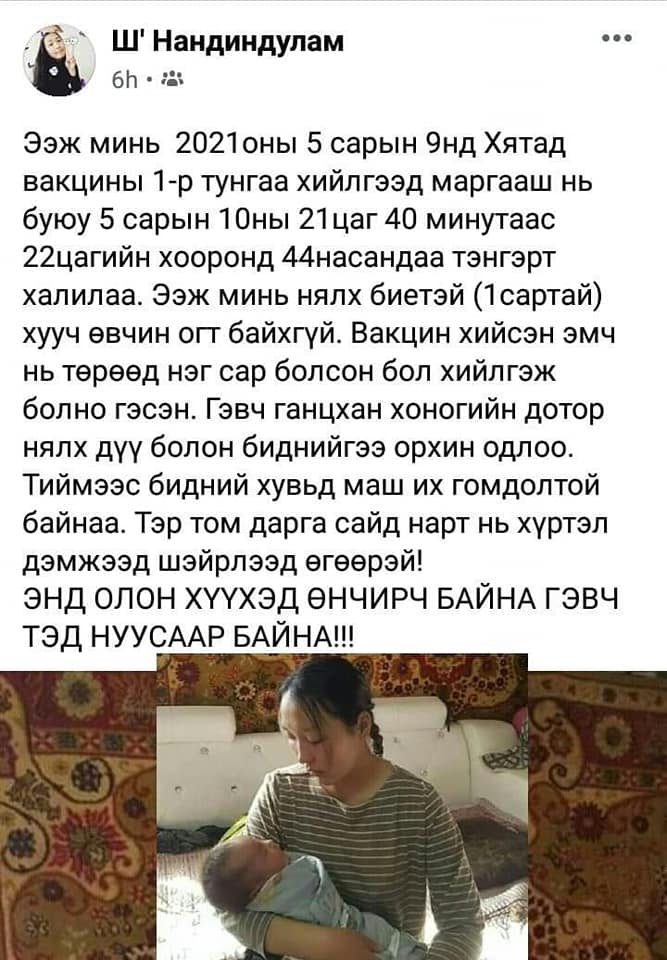 Тэрбээр " Ээж минь 2021 оны 5 сарын 9-нд Хятад вакцины 1-р тунгаа хийлгээд маргааш нь буюу 5 сарын 10ны 21 цаг 40 минутаас 22 цагийн хооронд 44 насандаа тэнгэрт халилаа. Ээж минь нялх биетэй (1сартай) хууч өвчин огт байхгүй. Вакцин хийсэн эмч нь төрөөд нэг сар болсон бол хийлгэж болно гэсэн. Гэвч ганцхан хоногийн дотор нялх дүү болон биднийгээ орхин одлоо.