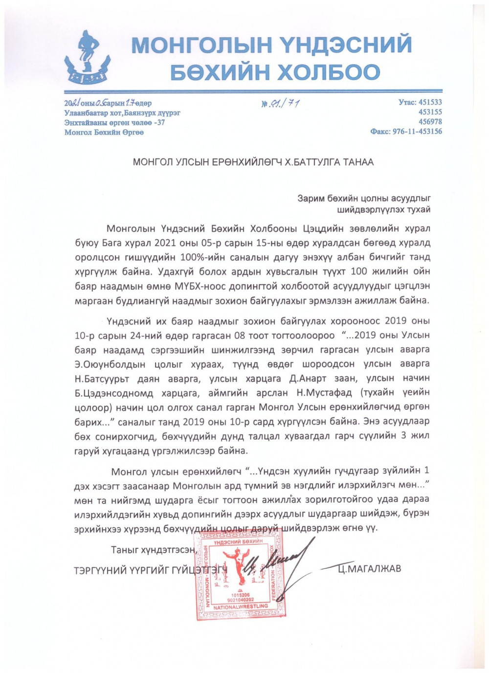 Монгол Улсын Ерөнхийлөгч “...Үндсэн хуулийн гучдугаар зүйлийн 1 дэх хэсэгт зааснаар Монголын ард түмний эв нэгдлийг илэрхийлэгч мөн...” мөн та нийгэмд шударга ёсыг тогтоон ажиллах зорилготойгоо удаа дараа илэрхийлдэгийн хувьд допингийн дээрх асуудлыг шударгаар шийдэж, бүрэн эрхийнхээ хүрээнд бөхчүүдийн цолыг даруй шийдвэрлэж өгнө үү.