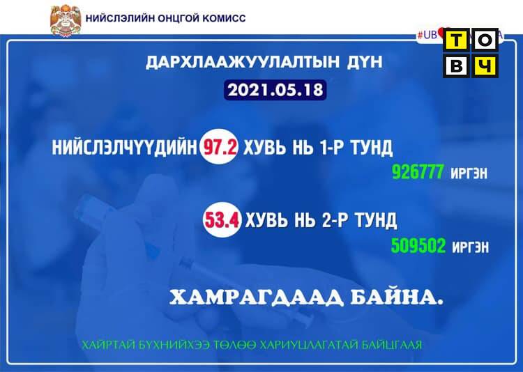 Вакцинжуулалт эхэлснээс хойш нийслэлийн 18-аас дээш насны иргэдийн 97.2 хувь буюу 926777 нь I тунд, 53.4 хувь буюу 509502 нь II тунд хамрагдаад байна.