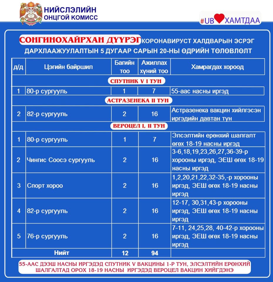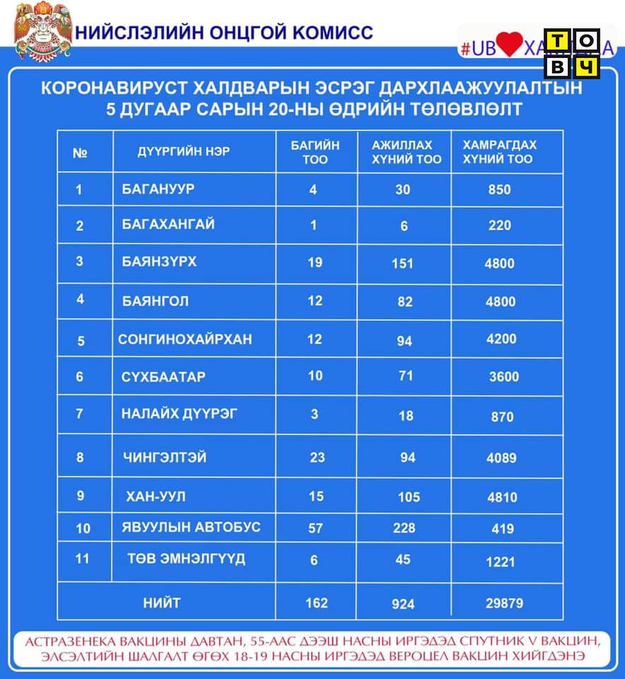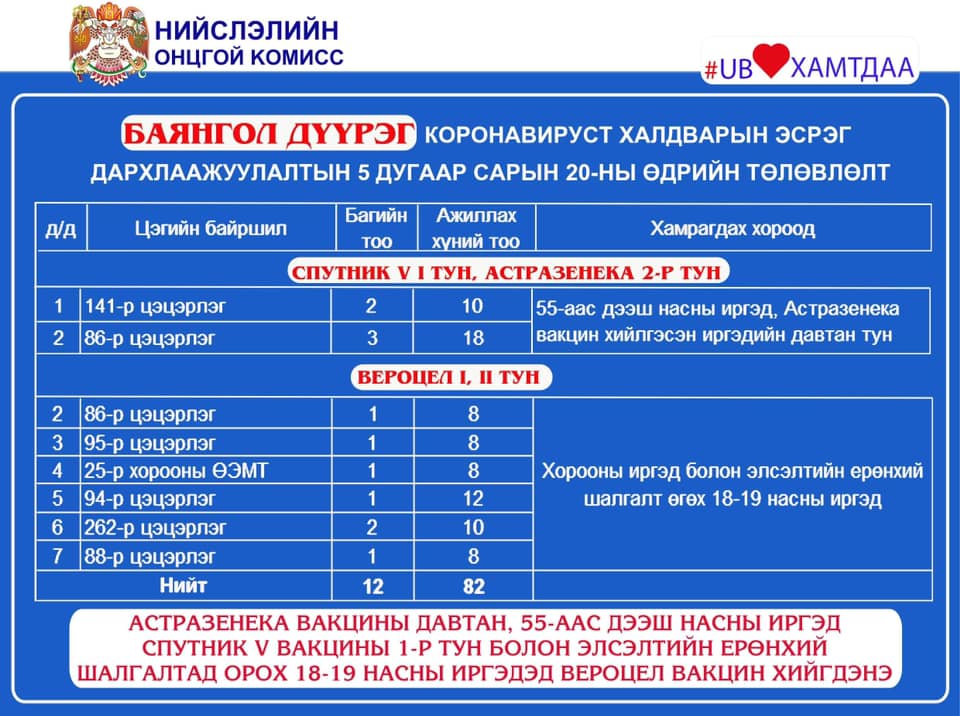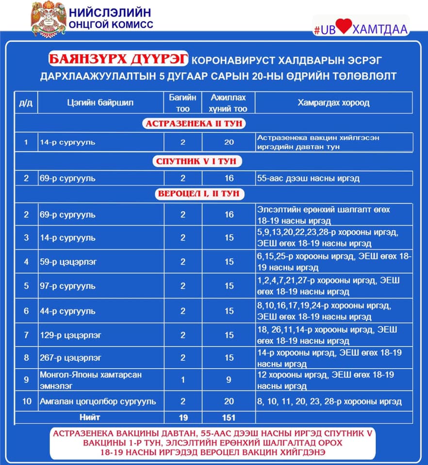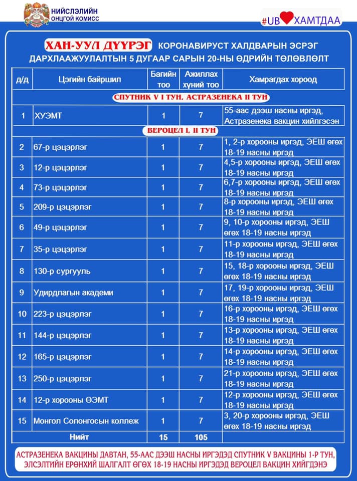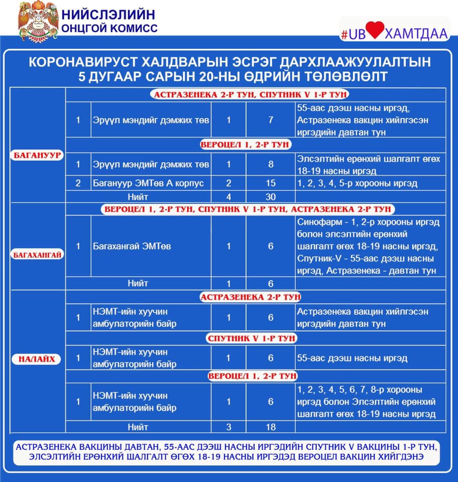 Өнөөдөр /2021.05.20/ Улаанбаатар хотод 55 суурин цэгт, 57 явуулын автобусаар 162 багийн 924 эмч, ажилтан ажиллаж, 29879 иргэнийг дархлаажуулахаар төлөвлөлөө.