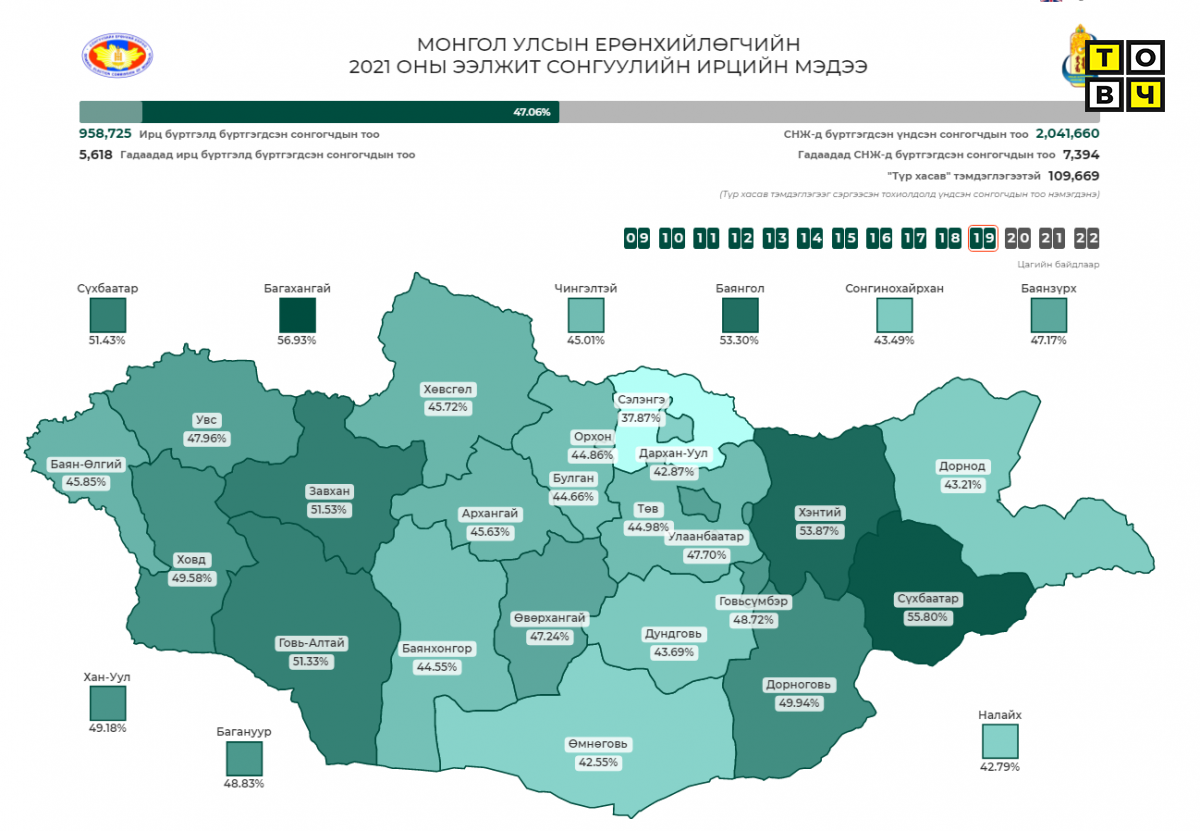 19:41 цагийн байдлаар орон нутагт Сүхбаатар аймгийн сонгогчдын 55.8 хувь хамгийн өндөр ирцтэй сонгуульдаа оролцож, саналаа өгч байгаа бол Хэний аймаг 53,8, Говь-Алтай 51,3, Завхан 51,5 хувьтай араас нь бичигджээ.