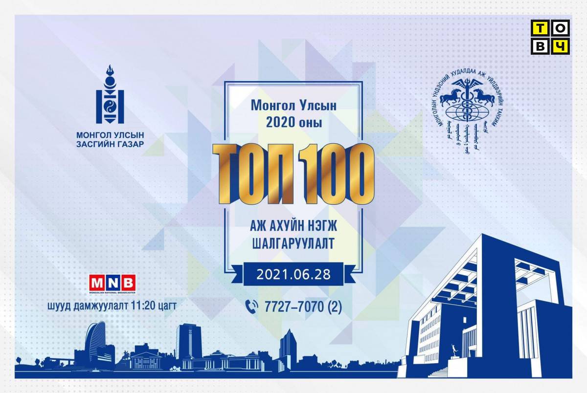 Монгол Улсын Засгийн газар, МҮХАҮТ хамтран 20 дахь жилдээ Монгол Улсын ТОП-100 аж ахуйн нэгжүүдийг эрэмбэлэн өргөмжлөх арга хэмжээг 2021 оны 6 дугаар сарын 28-нд зохион байгуулах гэж байна. Энэ оны хувьд коронавируст халдвар /КОВИД-19/ цар тахлын нөхцөл байдлаас шалтгаалж 2020 оны ТОП-100 аж ахуйн нэгжийг өргөмжлөх, эрэмбийг зарлах арга хэмжээг хоёр дахь жилдээ цахимаар зохион байгуулах бөгөөд маргааш 11:20 цагаас Монголын Үндэсний Олон Нийтийн Телевизээр шууд дамжуулах юм.