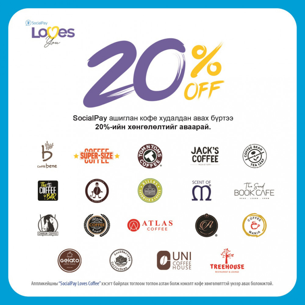 Та энэхүү аяны хугацаанд Улаанбаатар хотод байрлах нэр бүхий 19 кофе шоп болон тэдгээрийн нийт 50 гаруй салбараар үйлчлүүлэн өөрийн дуртай кофегоо SocialPay аппликэйшн ашиглан худалдан авах бүртээ 20%-ийн хөнгөлөлтийг авах юм.