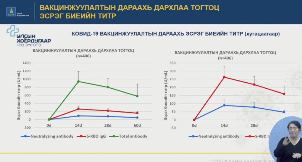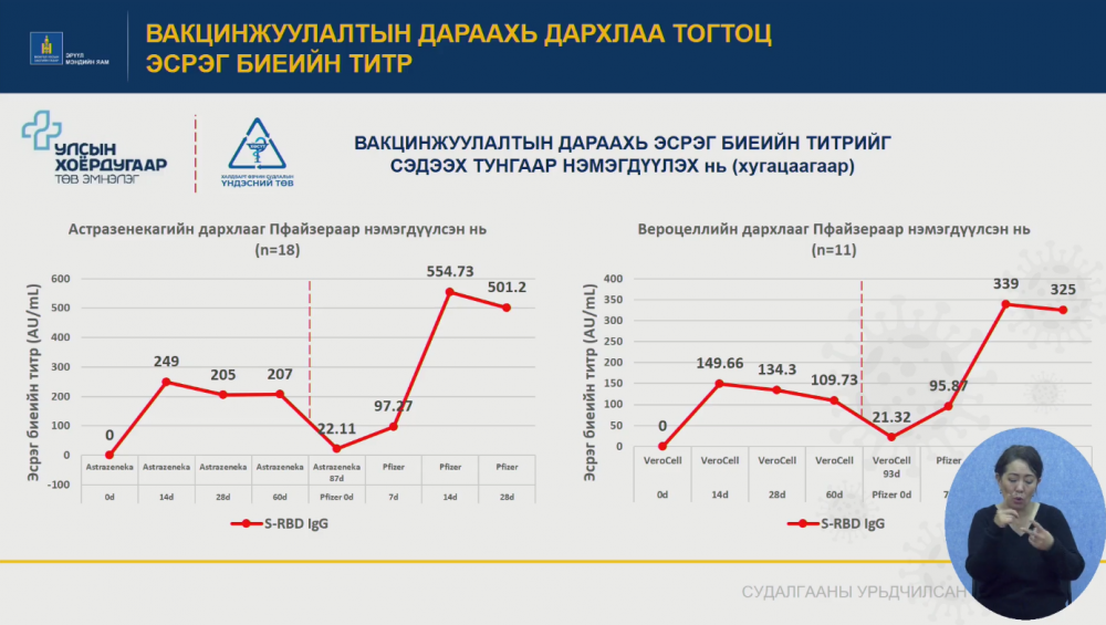 ЭМЯ-наас коронавирусний эсрэг вакцины нэмэлт тунгийн талаар мэдээлэл хийж байна. ЭМЯ-ны Судалгаа төлөвлөлтийн хэлтсийн дарга н.Бумдэлгэрийн танилцуулж байгаагаар вакцин хийснээс хойш 60 дахь эсрэг биеийн титр багасжээ.