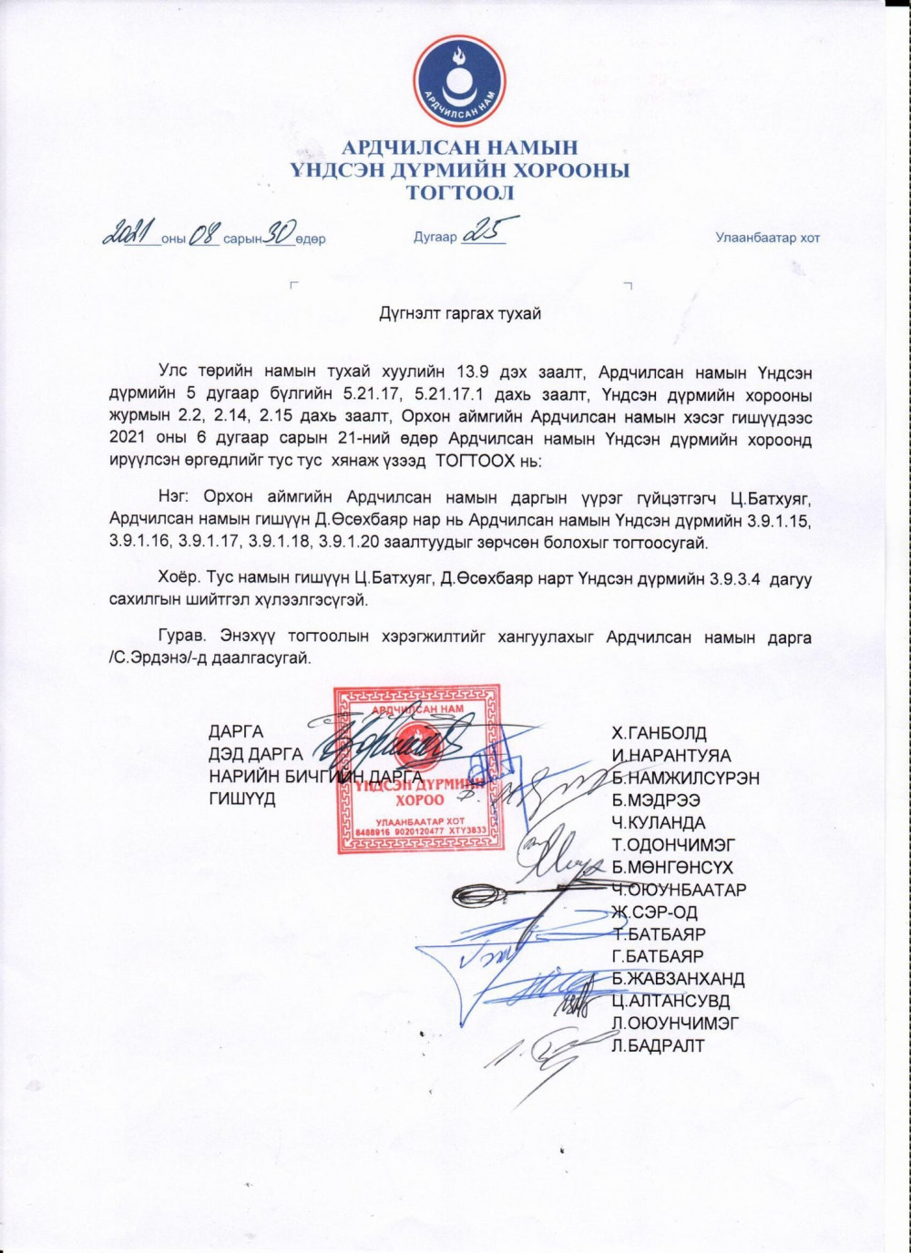 Өнөөдөр АН-ын ҮДХ Орхон аймгийн ардчилсан намын гишүүн Ц.Батхуяг, Д.Өсөхбаяр нарт хариуцлага тооцохоор шийдвэрлэжээ.