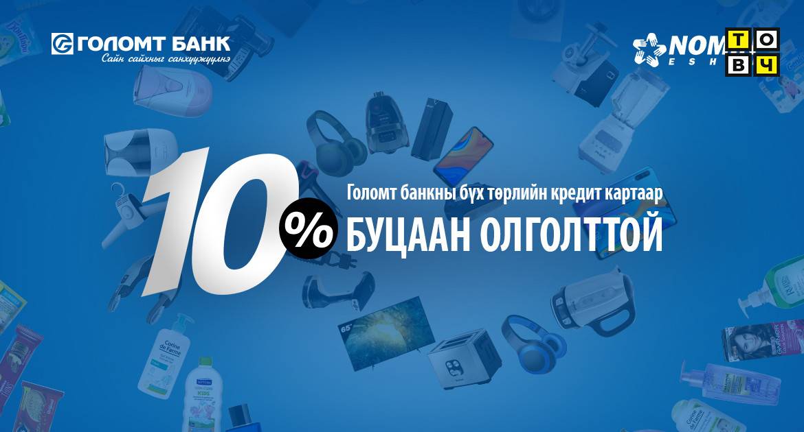 Голомт банк болон Nomin.mn хамтран 10 хувийн буцаан олголттой урамшууллыг зарлалаа. Тус урамшууллын хүрээнд Nomin.mn вэбсайтаас Голомт банкны бүх төрлийн кредит картаар худалдан авалт хийгээд нийт үнийн дүнгийн 10 хувийг буцаан авах боломжтой. Нэг харилцагчид олгох буцаан олголтын дээд хэмжээ 150,000 төгрөг ба буцаан олголтын урамшуулал 2021.10.08-ны дотор таны худалдан авалт хийсэн дансанд орох болно.