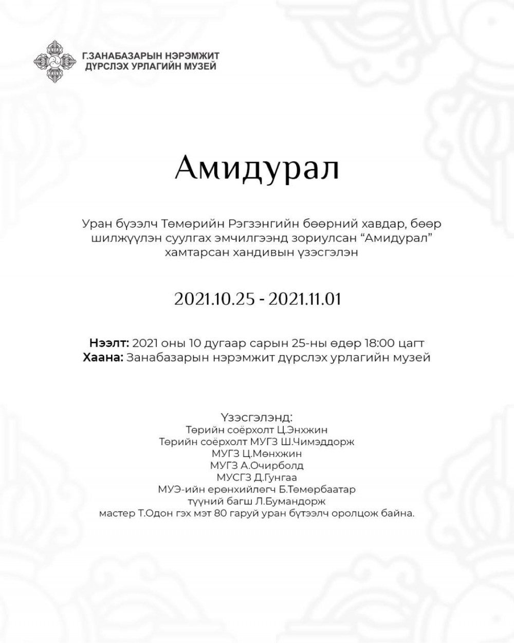 Тэрбээр “Миний найз зураач Т.Рэгзэн хүндээр өвдөж, одоогоор хоёр бөөр нь 95 хувь нь ажиллагаагүй болсон. Нэг талынх нь бөөрөн дээр хавдар үүссэн, биеийн байдал нь хүнд байна. Тиймээс зураачийн маань ах дүү, хамаатан садан, найз нөхөд нийлж, Амидурал гэх хандивын үзэсгэлэн худалдааг зохион байгуулах гэж байна. Энэ сарын 25-наас 7 хоногийн хугацаанд Занабазарын нэрэмжит дүрслэх урлагийн музейд болох уг үзэсгэлэнд Төрийн соёрхолт Ц.Энхжин, Төрийн соёрхолт, Урлагийн гавьяат зүтгэлтэн Ш.Чимэддорж, Урлагийн гавьяат зүтгэлтэн Ц.Мөнхжин нарын 80 гаруй уран бүтээлчдийн бүтээл тавигдахаас одоогоор 40 гаруй бүтээл нь цуглараад байна” гэлээ.