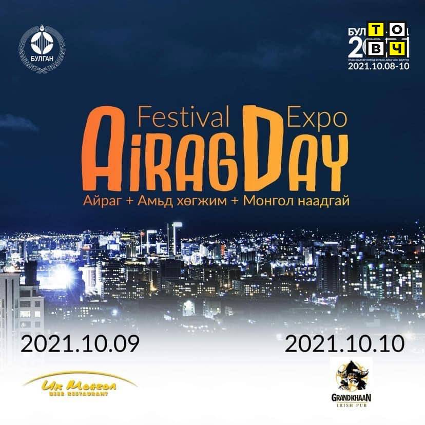 ✅ 2021.10.09-10 өдрүүдийн орой бүр Их Монгол уушийн өргөө, Grand Khaan Irish Pub-д болох "AIRAGDAY FESTIVAL"-д та бүхнийг морилон саатахыг урья. (Айраг + Амьд хөгжим + Монгол наадаан хөтөлбөр)