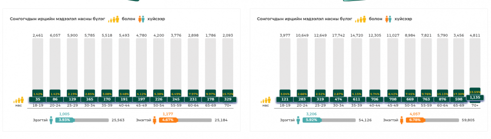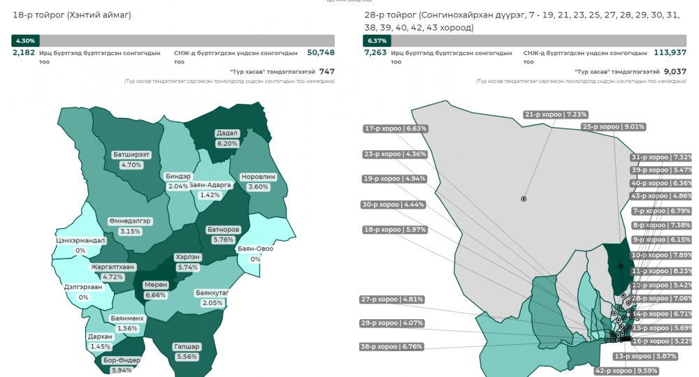 Хэнтий аймгийн 18 дугаар тойрогт сонгогчдын нэгдсэн жагсаалтад нийт 50748 сонгогч бүртгэгдсэнээс 10 цагийн байдлаар 4,30 хувь буюу 2182 сонгогч саналаа өгөөд байгаа бол СХД-ийн 28 дугаар тойргийн сонгогчдын 6,37 хувь нь саналаа өгөөд байна.