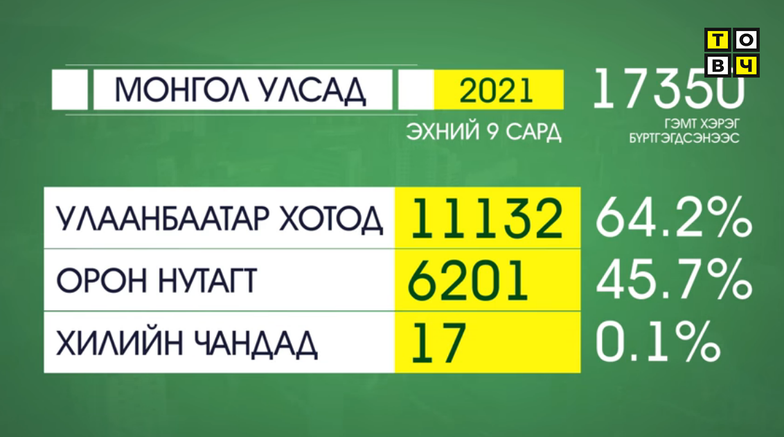 Монгол Улсын хэмжээнд 2021 оны эхний 9 сард бүртгэгдсэн нийт хэрэг.