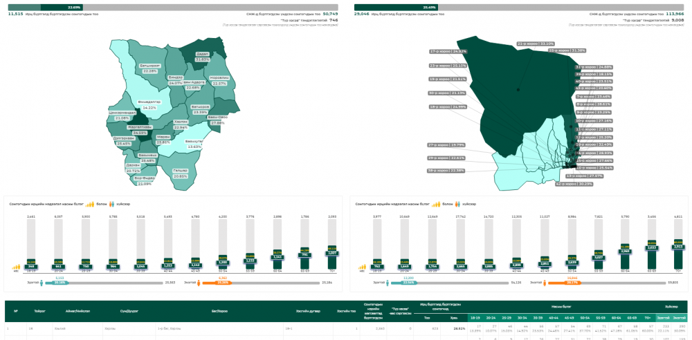 Тодруулбал, Хэнтий аймагт санал өгөх бүртгэлтэй 50 748 сонгогч, түр хасав тэмдэглэгээтэй 747 иргэнээс 10 641 буюу 20.1 хувь нь санал өгчээ. Харин Сонгинохайрхан дүүргийн нөхөн сонгуульд санал өгөх 113 398 сонгогч, түр хасав тэмдэглэгээтэй 9 036 сонгогч байгаагаас 26 508 буюу 23.2 хувь нь санал өгөөд байна.