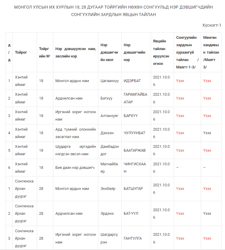 | 1 | Монгол ардын нам | 2021.10.06 | Үзэх | |