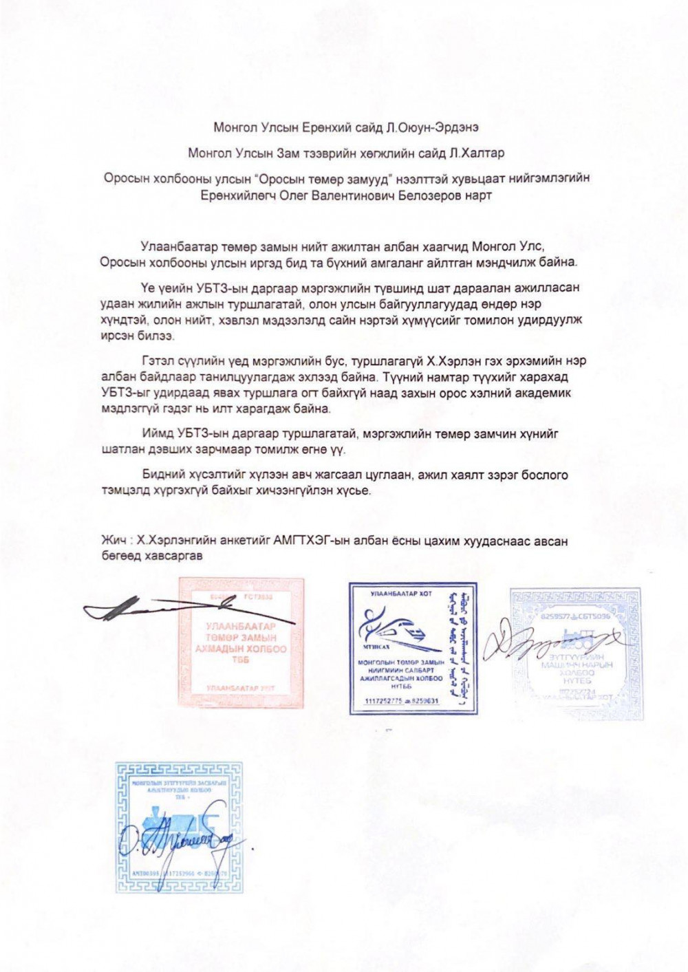 Монгол Оросын хамтарсан УБТЗ ХНН-ийн даргын суудал эрх баригчдын зодооны талбар болоод удаж байна. Өнгөрсөн хугацаанд дээрх албан тушаалд гурван хүн санал болгосон ч ОХУ-ын тал хүлээж аваагүй, голчихсон. Асуудал даамжирах тусам энэ албан тушаалд шунагчдын тоо нэмэгдэх нь гарцаагүй. Тиймээс Монгол Улсын Ерөнхий сайд Л.Оюун-Эрдэнэ “Оросын төмөр замууд” НХН (Нээлттэй хувьцаат нийгэмлэг)-ийн Ерөнхий захирал О.В.Белозеровтой өнгөрсөн долоо хоногт утсаар ярьж, “Улаанбаатар төмөр зам”-ын даргыг Монголын талын санал болгосноор ойрын хугацаанд томилохоор тохиролцсон.
