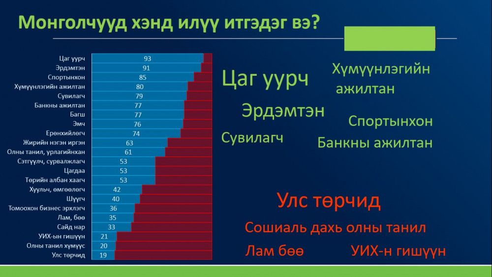 Судалгаанд оролцогчдоос та хэнд хамгийн их итгэдэг вэ гэж асуухад иргэд цаг уурын алба, сувилагч нар, банкны ажилтнууд, Ерөнхийлөгчид гэж хариулжээ.