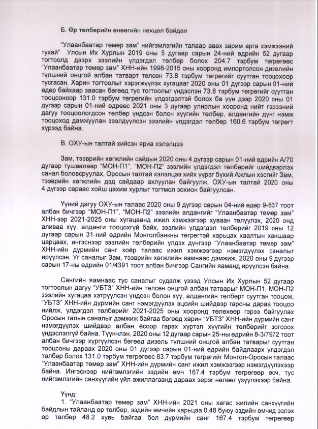 Түүнчлэн санал дүгнэлтэд Д.Тогтохсүрэнгийн ярьсанчлан УБТЗ ХНН-ийн зээлийн үлдэгдлийг Монгол болон ОХУ-ын талаас тэнцүү 83,7 тэрбум төгрөг гаргаж, дүрмийн санг нэмэгдүүлэх журмаар төлөхөөр тохиролцжээ. Гэхдээ УБТЗ ХНН бол төрийн өмчит компани. Төр төсвөөс мөнгө гаргаж, дүрмийн санг нэмэгдүүлж гэмээнэ хоёр талын тохиролцоо хүчинтэй болох учиртай. Харин энэ шийдвэрээ төсвөөс нэг ч төгрөг гарахгүй хэмээн тайлбарлаж байгаа нь хэтэрхий өрөөсгөл гэдгийг иргэд хэлж байна.