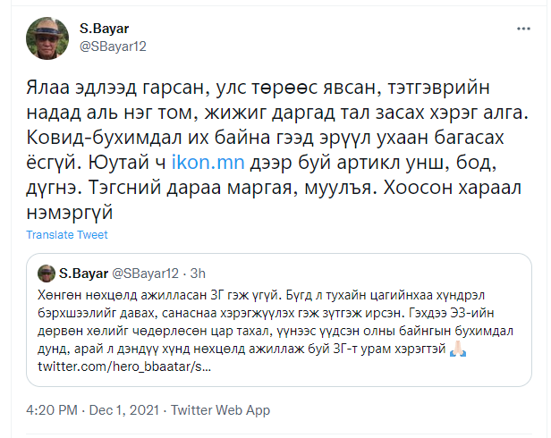 Ялаа эдлээд гарсан, улс төрөөс явсан, тэтгэврийн надад аль нэг том, жижиг даргад тал засах хэрэг алга. Ковид-бухимдал их байна гээд эрүүл ухаан багасах ёсгүй” хэмээн жиргэсэн байна.