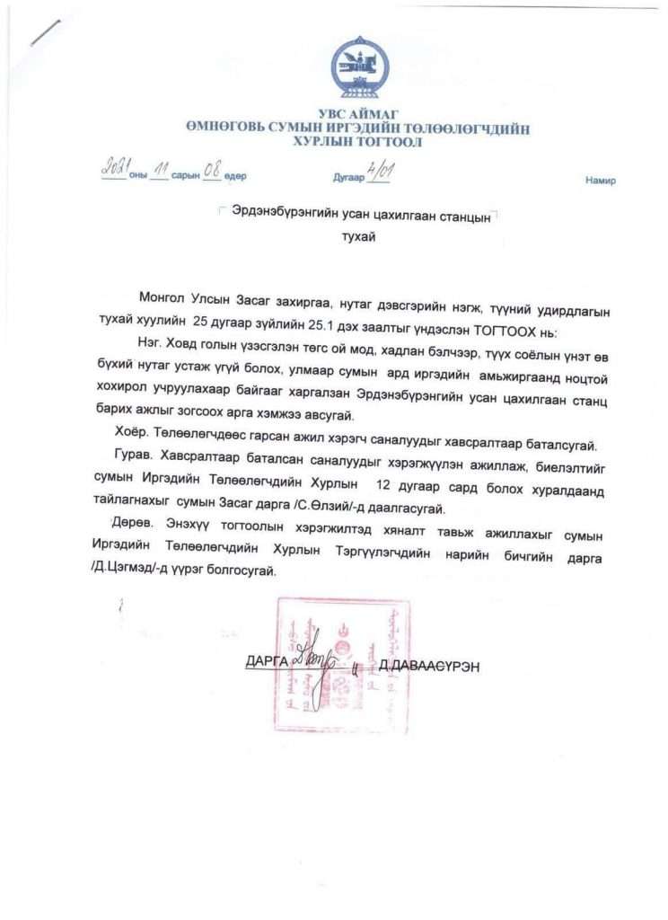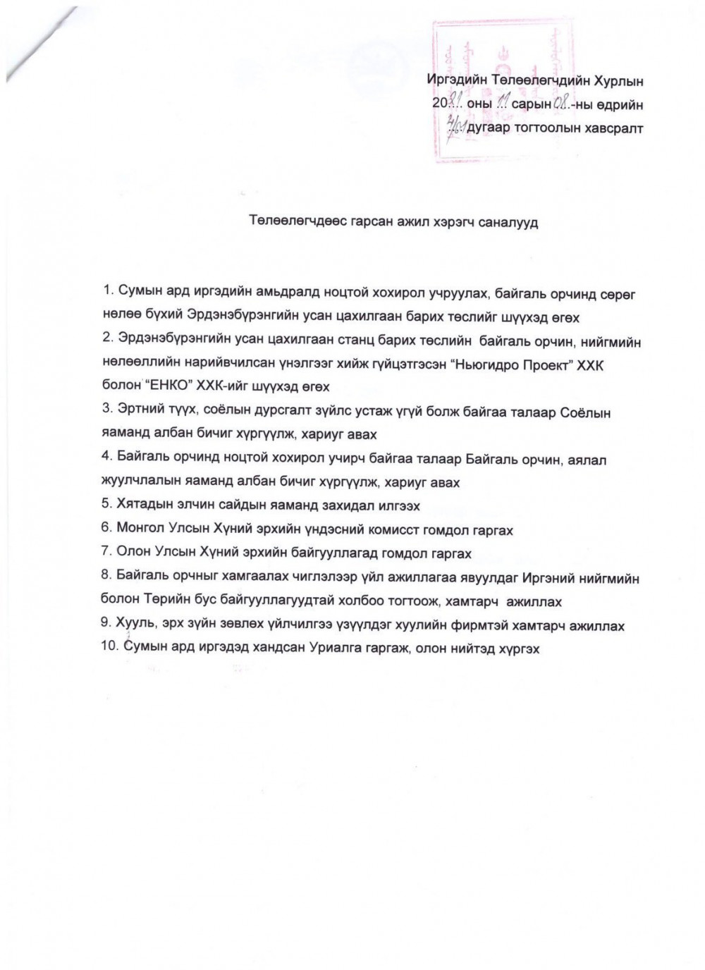 Тодруулбал, сумын иргэдийн амьдралд ноцтой хохирол учруулах, байгаль орчинд сөрөг нөлөө бүхий Эрдэнэбүрэнгийн усан цахилгаан станц барих төслийг шүүхэд өгөх, байгаль орчин, нийгмийн нөлөөллийн нарийвчилсан үнэлгээг хийсэн “Ньюгидро Проект”болон “ЭНКО” ХХК-ийг шүүхэд өгөх, эртний түүх, соёлын дурсгалт зүйлс устаж үгүй болж байгаа талаар Соёлын яаманд албан бичиг хүргүүлж, хариу авах, Хятадын элчин сайдын яаманд захидал илгээх, Хүний эрхийн комисст гомдол гаргах, олон улсын хүний эрхийн байгууллагад хандах зэрэг саналуудыг гаргаж, хэрэгжүүлэн ажиллах, биелэлтийг сумын ИТХ-ын 12 дугаар сард болох хуралдаанд тайлахыг сумын Засаг дарга С.Өлзийд даалгасан байна.