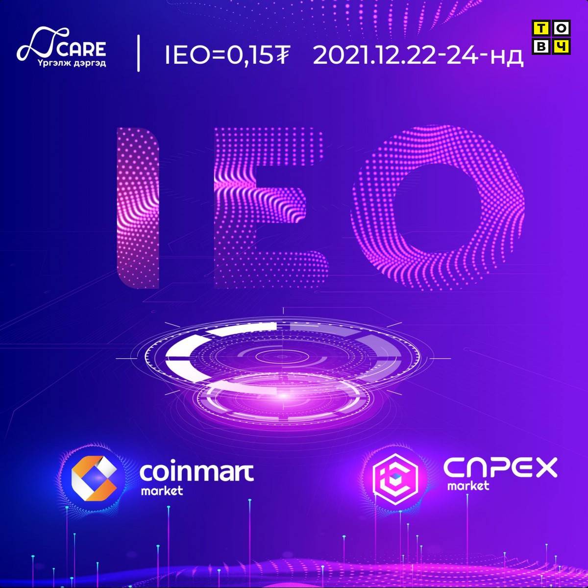 Орчин цагийн цахим мөнгө болох койныг хэрэглээнд нэвтрүүлж тэр дундаа эрүүл мэндийн салбарын цахим хэрэглээний мөнгө болгохоор CARE COIN аль хэдийнээ өөрсдийн www.care.mn сайтаараа дамжуулан 0,10 мөнгөөр урьдчилсан захиалгаа аваад эхлэсэн. Харин энэ сарын буюу 2021.12.22-ноос 24-ны хооронд www.coinmart.mn, www.capex.mn биржүүд дээр IEO – 0,15 мөнгөөр зарлагдах гэнэ.