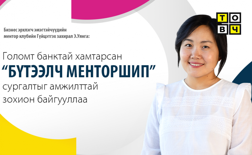 Голомт банкны зүгээс эмэгтэйчүүдэд санхүүгийн үйлчилгээг илүү хүртээмжтэй, ахисан түвшинд хүргэж, бизнесээ өргөжүүлэн тэлэхэд шаардлагатай мэргэжлийн сургалт, зөвлөгөө болон санхүүгийн дэмжлэг туслалцааг хүргэх зорилго бүхий “Бизнес эрхлэгч эмэгтэйчүүдийг дэмжих” хөтөлбөрийг 1 жилийн турш амжилттай хэрэгжүүллээ. Бид энэ хөтөлбөрийн хүрээнд Бизнес эрхлэгч эмэгтэйчүүдийн ментор клубтэй хамтран олон үр өгөөжтэй сургалтуудыг зохион байгуулж байсан. Харин энэхүү цуврал сургалтын хамгийн сүүлийн дугаар “Бүтээлч менторшип” сэдвийн хүрээнд амжилттай зохион байгуулагдаж өндөрлөлөө. Бид цуврал сургалтын сургагч багшаар ажилласан Бизнес эрхлэгч эмэгтэйчүүдийн ментор клубийн Гүйцэтгэх захирал Э.Уянгатай хэдэн хором ярилцсаныг хүргэж байна.
