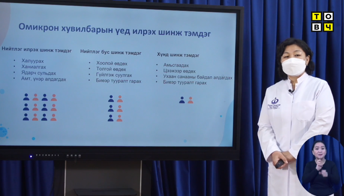 КОВИД-19 Омикрон хувилбарын онцлогийн талаар УНТЭ, Уушги, харшил судлалын төвийн дарга Б.Одончимэг мэдээлэл хийж байна.