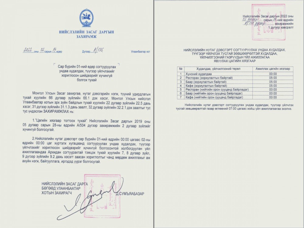 ШУУД: Зарим худалдаа, үйлчилгээний газруудын ажиллах цагийн хязгаар болон сар бүрийн 1-ний өдөр согтууруулах ундаа худалдах, түүгээр үйлчлэхийг хориглосон шийдвэрийг хүчингүй болгосон талаар мэдээлэл хийж байна.
