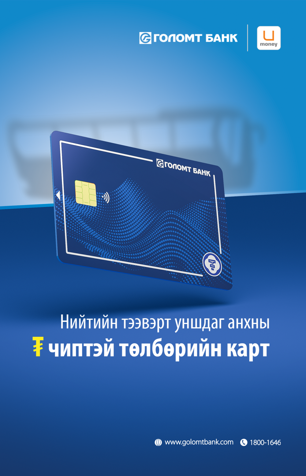 Голомт банкны “U money ₮ чиптэй карт”-ыг та автобусанд шууд уншуулж зорчихоос гадна бусад төлбөр тооцоо хийхдээ ч ашиглах цогц боломжийг бид бүрдүүлж буй юм. Түүнчлэн тус карт нь хэрэглэгчдийн аюулгүй байдлыг бүрэн хангасан, өндөр нууцлал бүхий EMV/NFC дэвшилтэт технологийг ашигласан, тусгайлан цэнэглэх шаардлагагүй гэх мэт онцлог давуу талуудтай юм.