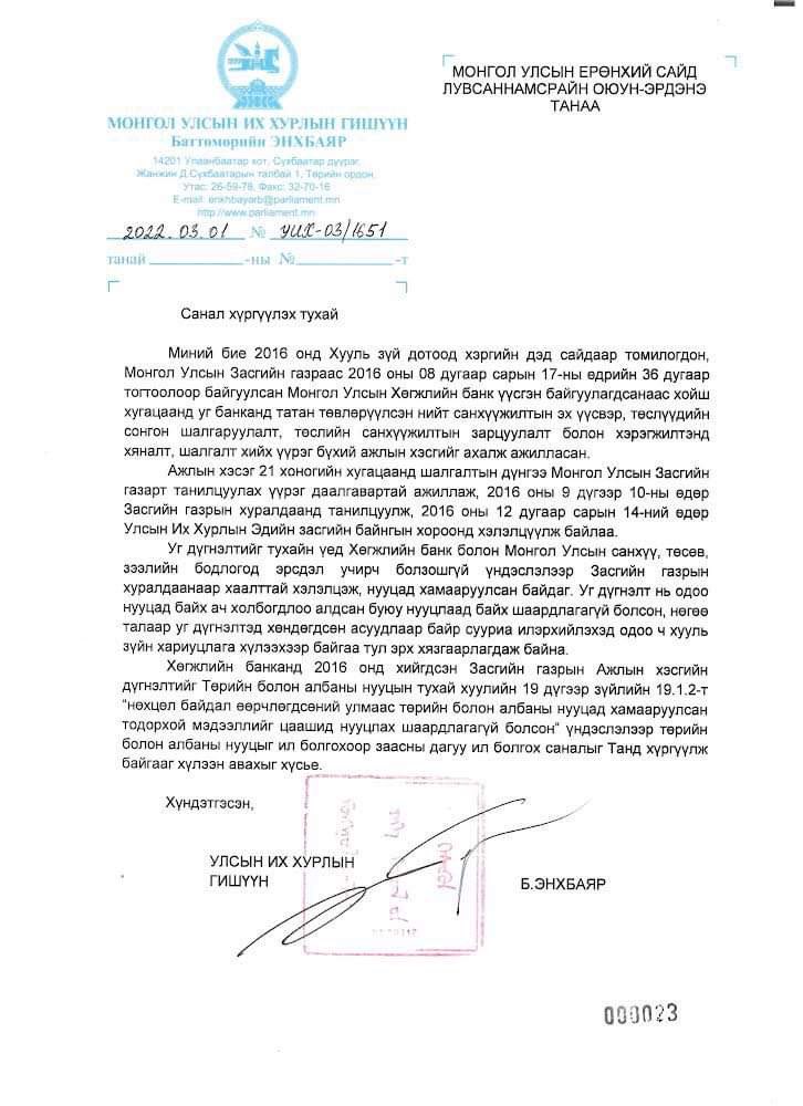 Тэрбээр энэ талаар цахим хуудастаа “Хууль зүй, дотоод хэргийн дэд сайдаар ажиллаж байх үедээ ахлан Хөгжлийн банканд Монгол Улсын Засгийн газраас 2016 онд хийгдсэн бөгөөд Засгийн газар хаалттай хэлэлцсэн хяналт шалгалтын Ажлын хэсгийн дүгнэлтийг нууцаас гаргах хүсэлтийг Ерөнхий сайд Л.Оюун-Эрдэнэд хандан тавилаа” гэсэн байна.